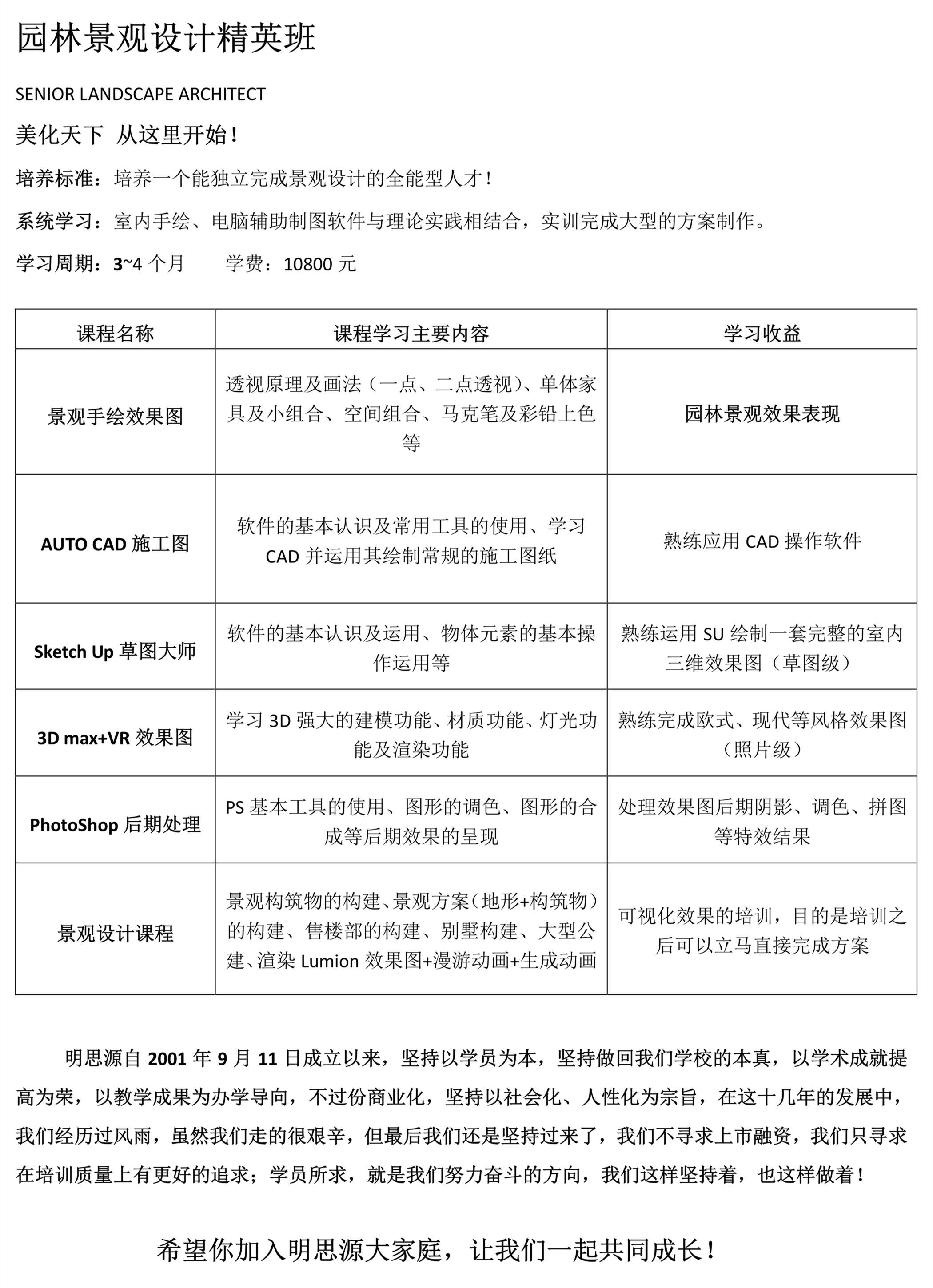 艺术造型基础课、美术专业课程、景观手绘效果图、AUTO CAD施工图、Sketch Up草图大师、3D max+VR效果图、PhotoShop后期处理、景观设计课程、景观方案实训课程